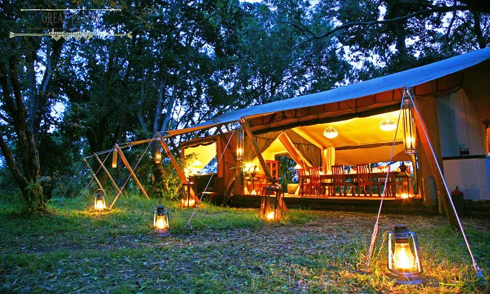 The camp itself consists of five custom-designed tents of light-colored flowing canvas open on the horizontal side with canopied ceilings. Set at ground level, and shaded by the riverine forest, this camp is designed for those who want the particulars of a Great Plains property but are willing to forgo some of the fancier amenities. Still, you will not want for much. En-suite facilities including flush loos, bucket showers and tapped hot/cold water ensure utter comfort. 24-hour electricity, fine dining and exceptional hospitality round out what can hardly be called sparse.
