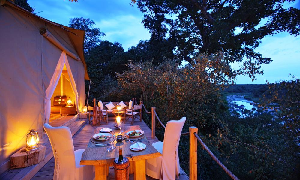 Dining and relaxing usually takes place in the main ‘Mess Tent’ or under the shade of the adjacent trees, ideally located overlooking a wide bend of the Talek river. Comfortable floor-cushions, rugs and sofas invite the weary to relax and enjoy the sounds of the wilderness. The evening camp-fire provides a welcome spot for pre-dinner drinks after a day of wildlife viewing. Meals are made from the finest fresh ingredients prepared by our experienced chefs. Dinner is usually enjoyed at the long banquet table, whilst breakfast and lunch may be under the shade of the surrounding trees whilst watching the resident pod of hippos.